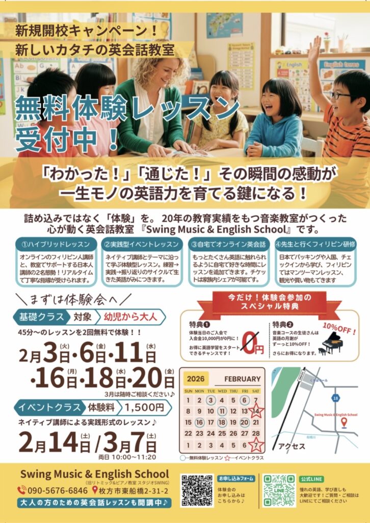 実践からの学びを特色とするSwingならではの音楽、英語のレッスン、今ならどちらも無料体験レッスン受付中。(一部有料レッスンもありますので、詳細はお尋ねください)
